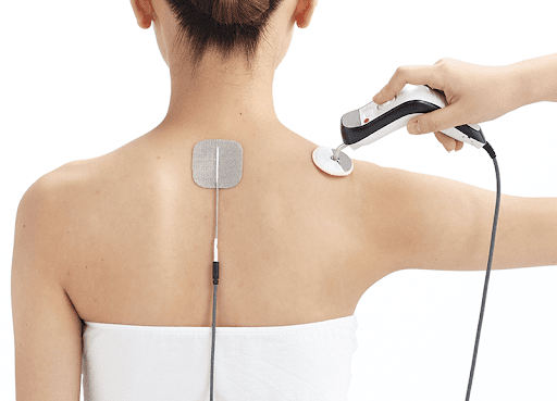 干渉波治療器 筋肉を収縮・拡張させてそのポンピング作用により筋肉をほぐし、血流を促進させて痛みの物質や筋硬結の除去を図ります。